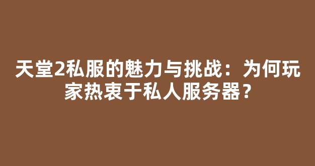 在《天堂2》这款经典的多人在线角色扮演游戏中,私人服务器(私服)逐渐成为了玩家们的热衷选择。与官方服务器相比,私人服务器提供了不同的游戏体验和更为自由的玩法,吸引了大批玩家的参与。那么,天堂2私服究竟有哪些魅力与挑战呢?为什么玩家们如此热衷于这些私人服务器?接下来,我们将全面探讨这一话题。